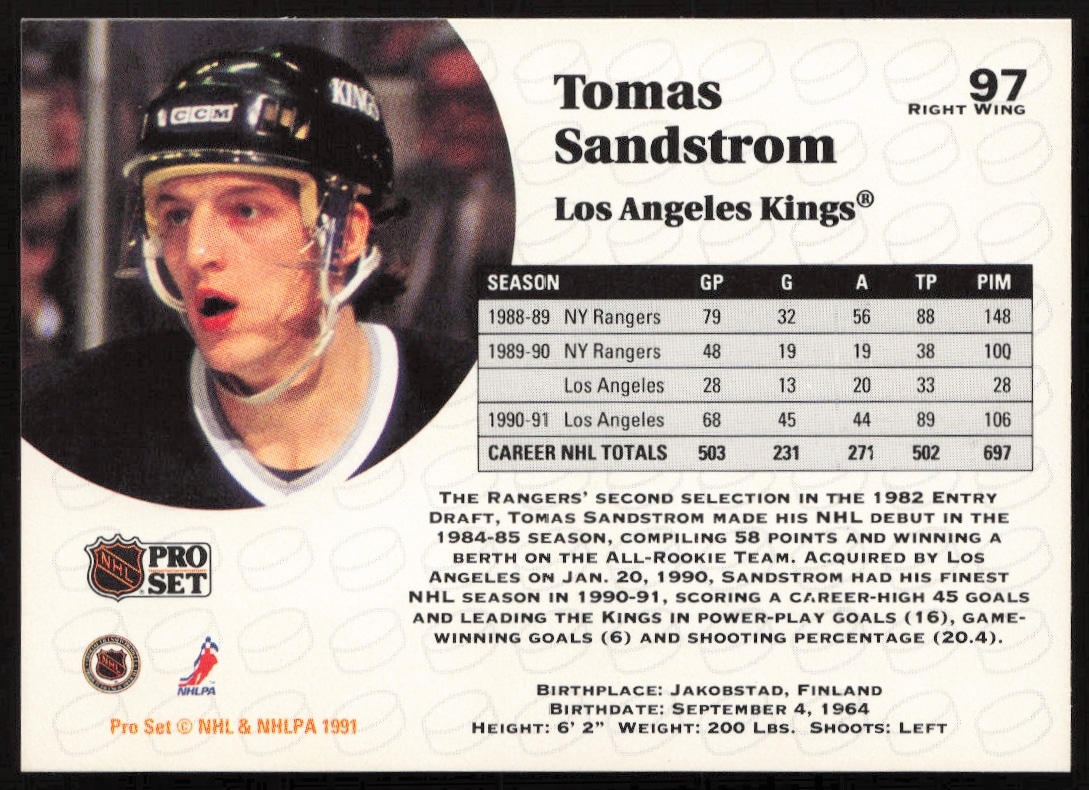This Hockey card, from 1991-92 is part of the Pro Set NHL card set. Tomas Sandstrom is featured and has a card number of 97.