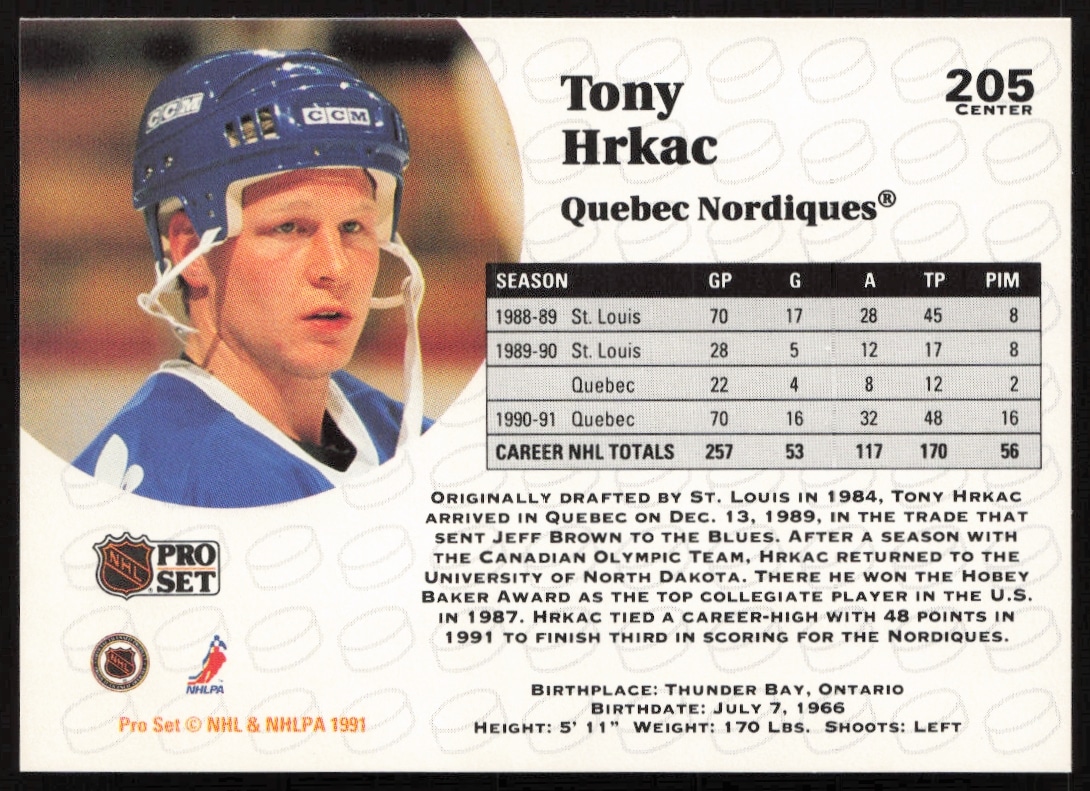 This Hockey card, from 1991-92 is part of the Pro Set NHL card set. Tony Hrkac is featured and has a card number of 205.