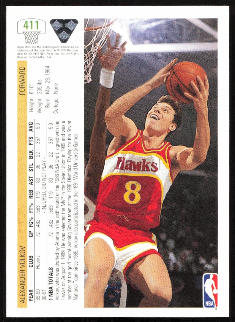 This Basketball card, from 1991-92 is part of the Upper Deck card set. Alexander Volkov is featured and has a card number of 411.