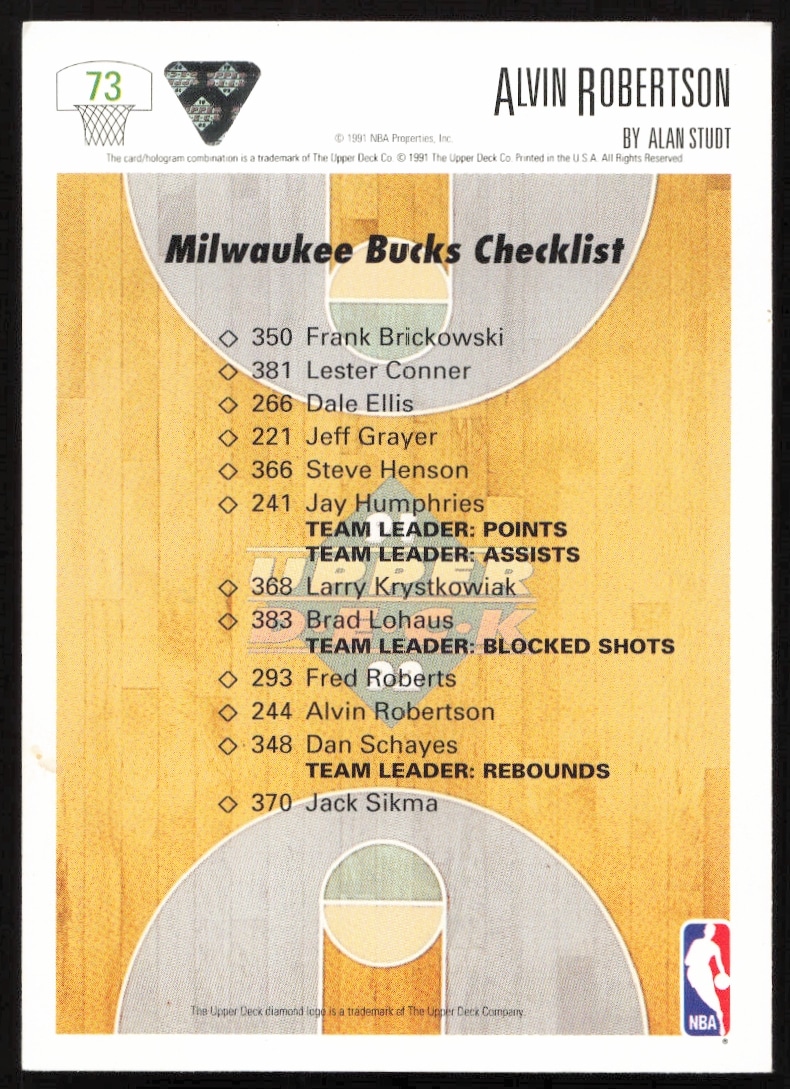 This Basketball card, from 1991-92 is part of the Upper Deck card set. Alvin Robertson is featured and has a card number of 73.