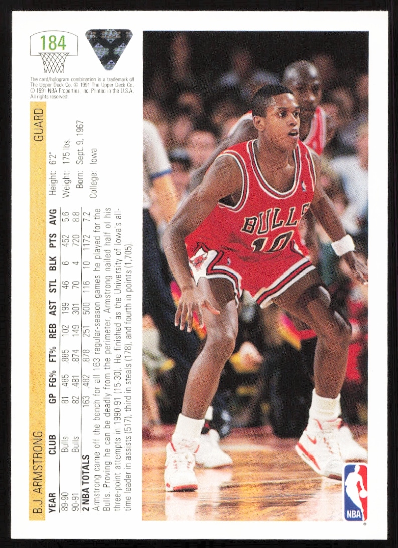 This Basketball card, from 1991-92 is part of the Upper Deck card set. B.J. Armstrong is featured and has a card number of 184.