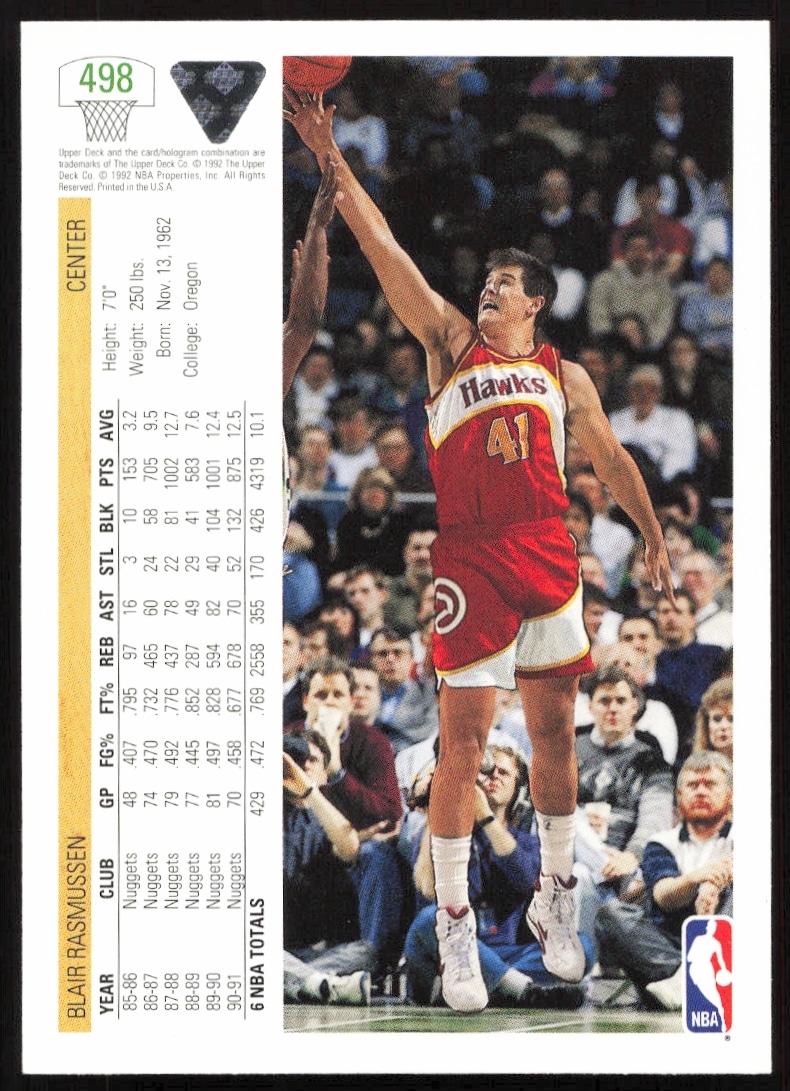 This Basketball card, from 1991-92 is part of the Upper Deck card set. Blair Rasmussen is featured and has a card number of 498.