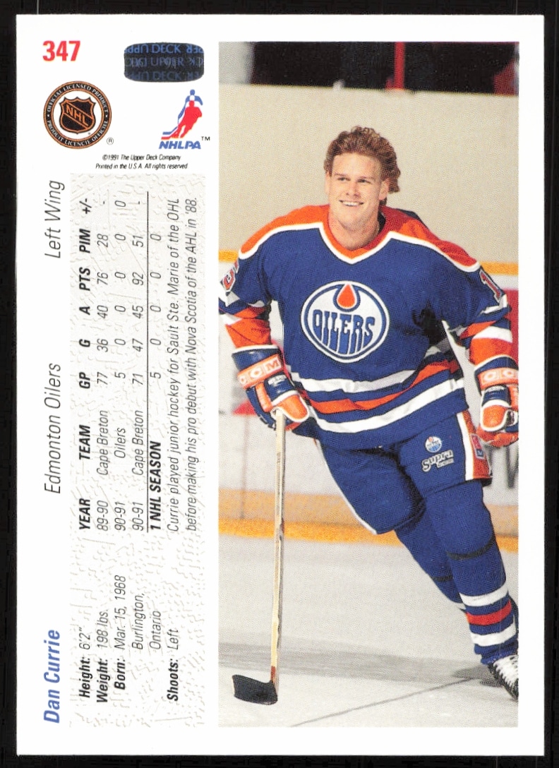 This Hockey card, from 1991-92 is part of the Upper Deck card set. Dan Currie is featured and has a card number of 347.