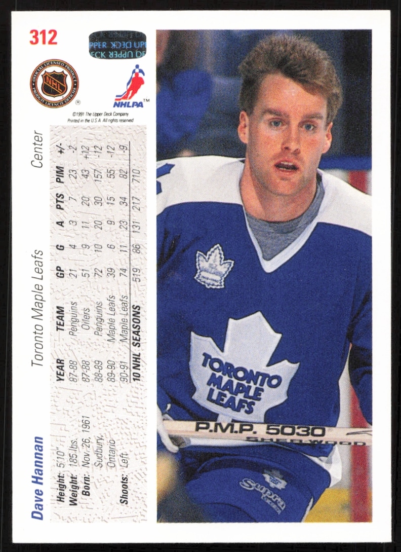 This Hockey card, from 1991-92 is part of the Upper Deck card set. Dave Hannan is featured and has a card number of 312.