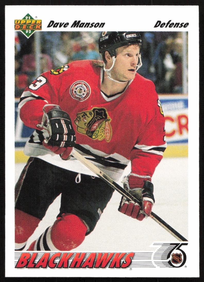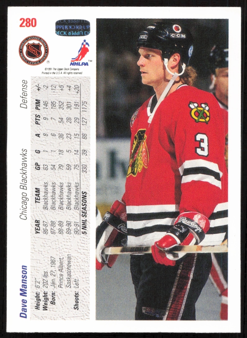 This Hockey card, from 1991-92 is part of the Upper Deck card set. Dave Manson is featured and has a card number of 280.