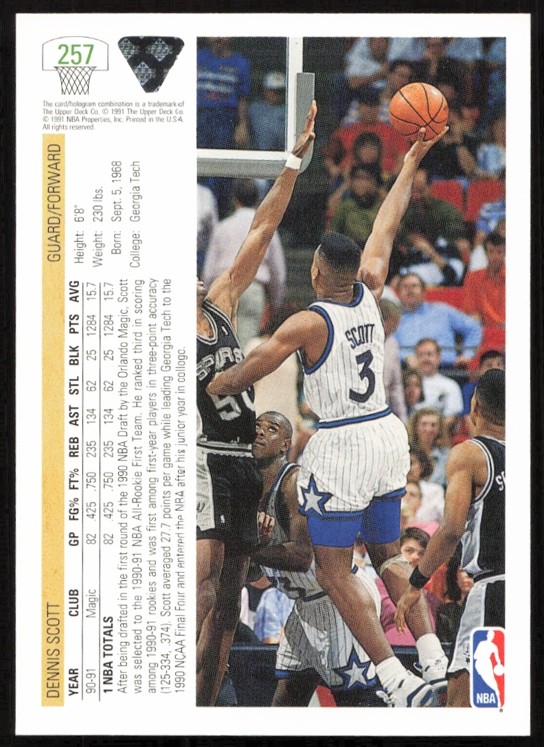 This Basketball card, from 1991-92 is part of the Upper Deck card set. Dennis Scott is featured and has a card number of 257.