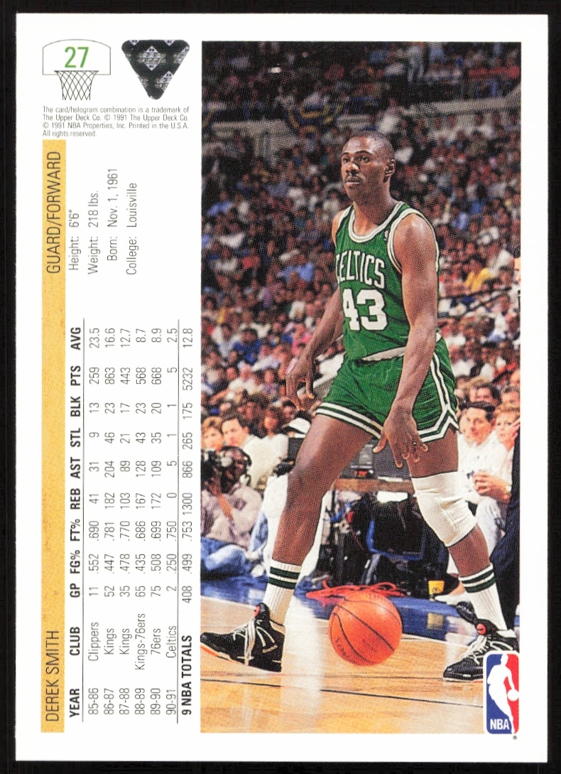 This Basketball card, from 1991-92 is part of the Upper Deck card set. Derek Smith is featured and has a card number of 27.