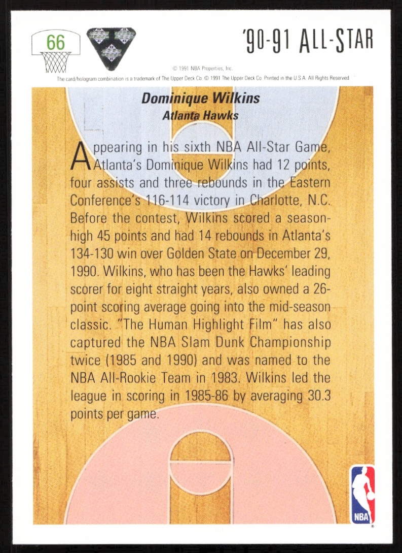 This Basketball card, from 1991-92 is part of the Upper Deck card set. Dominique Wilkins is featured and has a card number of 66.