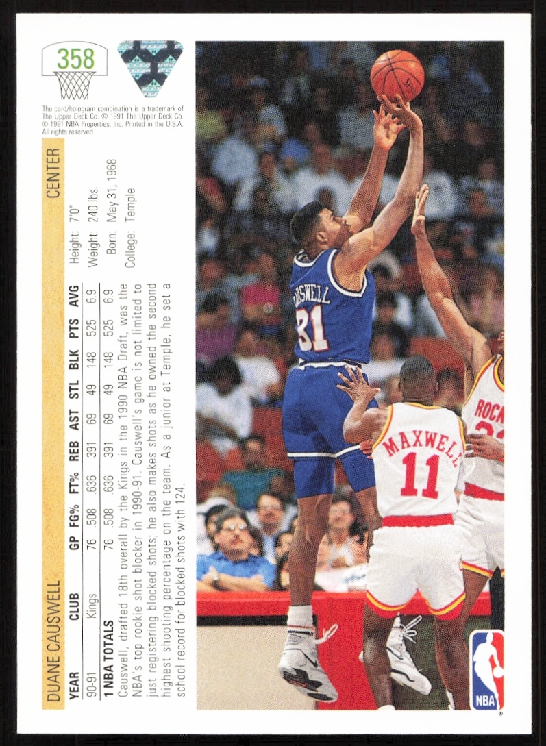 This Basketball card, from 1991-92 is part of the Upper Deck card set. Duane Causwell is featured and has a card number of 358.