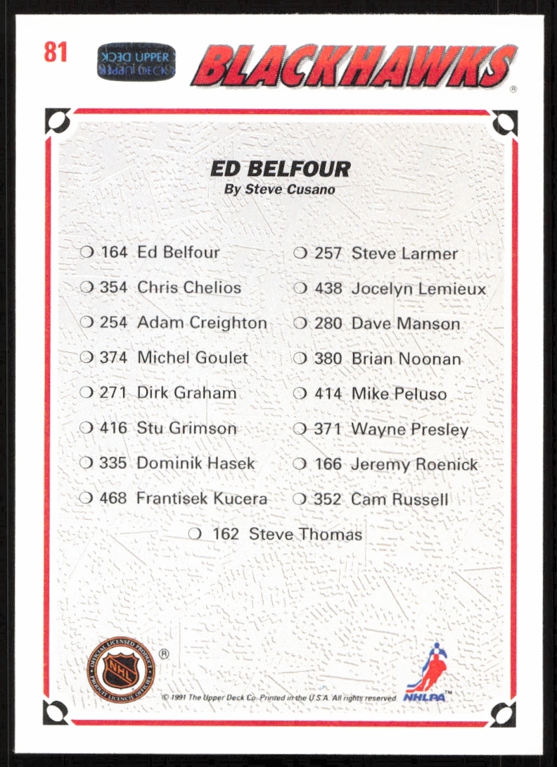 This Hockey card, from 1991-92 is part of the Upper Deck card set. Ed Belfour is featured and has a card number of 81.
