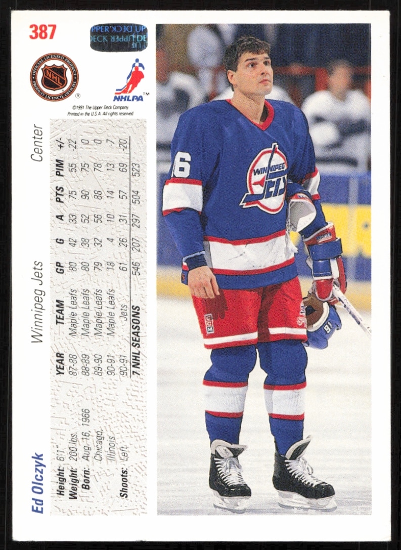This Hockey card, from 1991-92 is part of the Upper Deck card set. Ed Olczyk is featured and has a card number of 387.