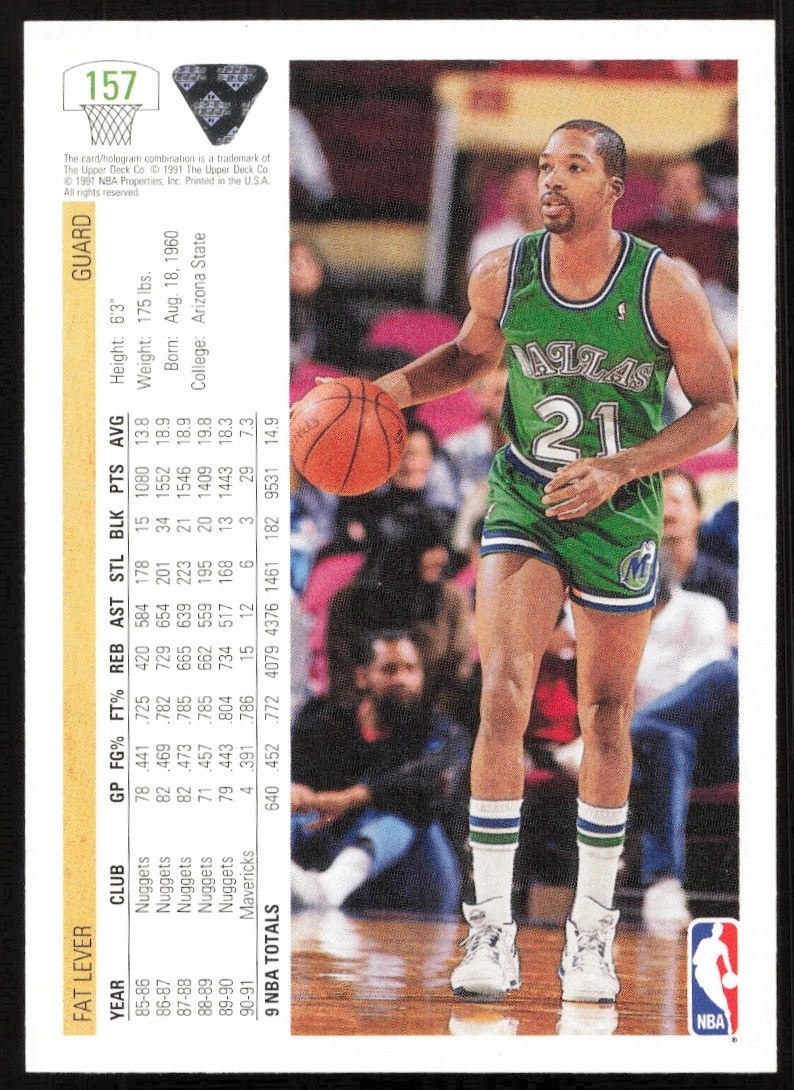 This Basketball card, from 1991-92 is part of the Upper Deck card set. Fat Lever is featured and has a card number of 157.