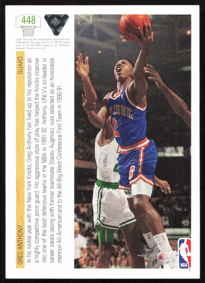 This Basketball card, from 1991-92 is part of the Upper Deck card set. Greg Anthony is featured and has a card number of 448.