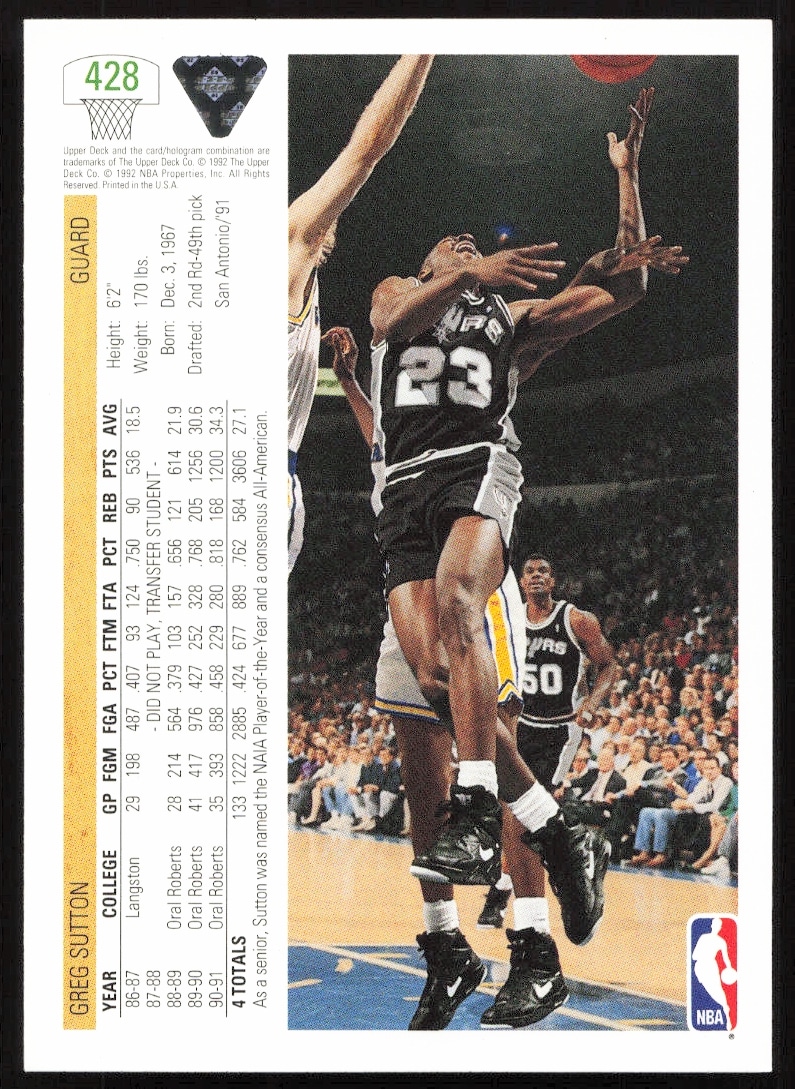 This Basketball card, from 1991-92 is part of the Upper Deck card set. Greg Sutton is featured and has a card number of 428.