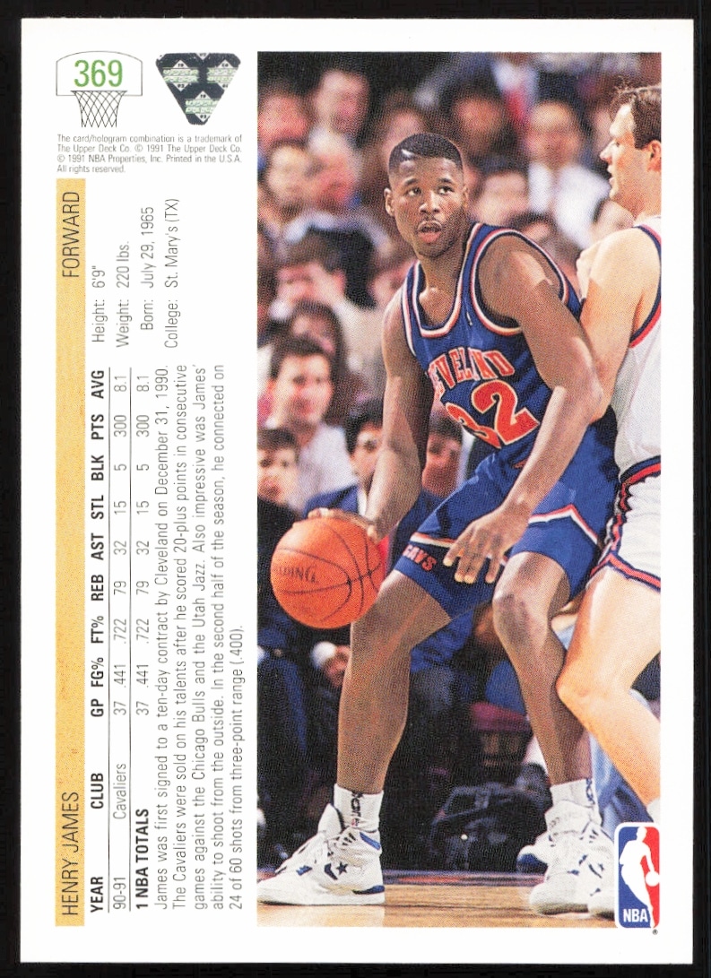 This Basketball card, from 1991-92 is part of the Upper Deck card set. Henry James is featured and has a card number of 369.