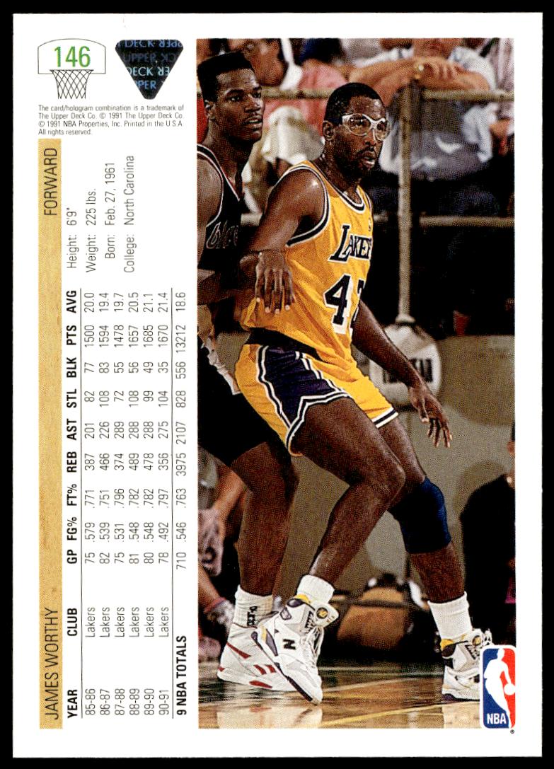 This BasketballΒ card, from 1991-92 is part of the Upper Deck Β card set. James Worthy is featured and has a card number of 146.