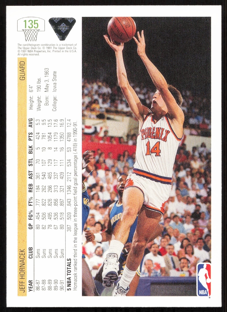 This Basketball card, from 1991-92 is part of the Upper Deck card set. Jeff Hornacek is featured and has a card number of 135.