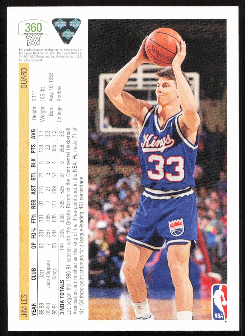This Basketball card, from 1991-92 is part of the Upper Deck card set. Jim Les is featured and has a card number of 360.
