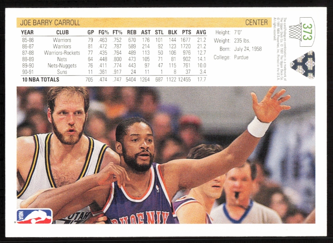 This Basketball card, from 1991-92 is part of the Upper Deck card set. Joe Barry Carroll is featured and has a card number of 373.