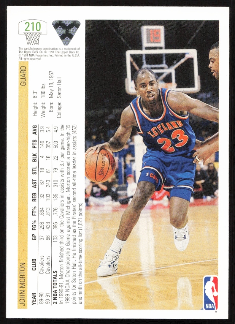 This Basketball card, from 1991-92 is part of the Upper Deck card set. John Morton is featured and has a card number of 210.