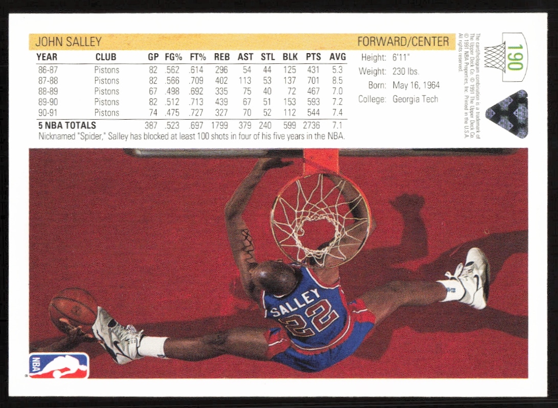 This Basketball card, from 1991-92 is part of the Upper Deck card set. John Salley is featured and has a card number of 190.