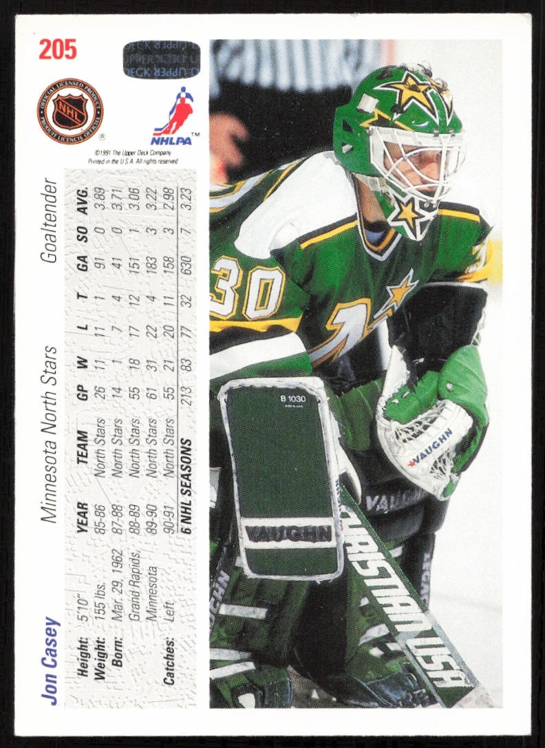 This Hockey card, from 1991-92 is part of the Upper Deck card set. Jon Casey is featured and has a card number of 205.
