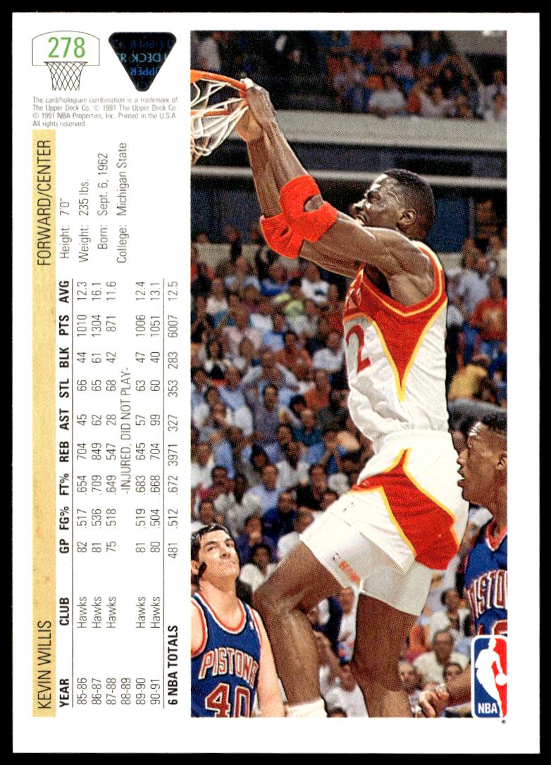 This Basketball card, from 1991-92 is part of the Upper Deck  card set. Kevin Willis is featured and has a card number of 278.