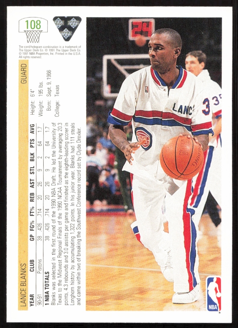 This Basketball card, from 1991-92 is part of the Upper Deck card set. Lance Blanks is featured and has a card number of 108.