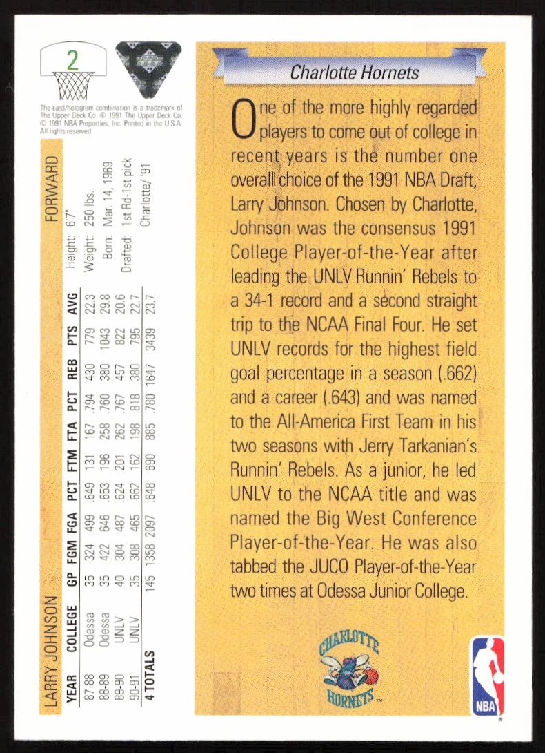 This Basketball card, from 1991-92 is part of the Upper Deck card set. Larry Johnson is featured and has a card number of 2.