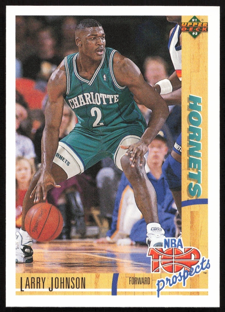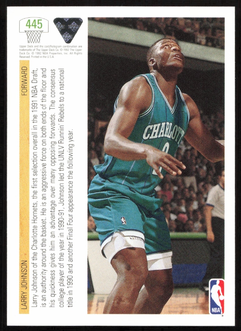 This Basketball card, from 1991-92 is part of the Upper Deck card set. Larry Johnson is featured and has a card number of 445.