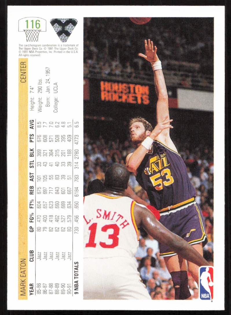This Basketball card, from 1991-92 is part of the Upper Deck card set. Mark Eaton is featured and has a card number of 116.