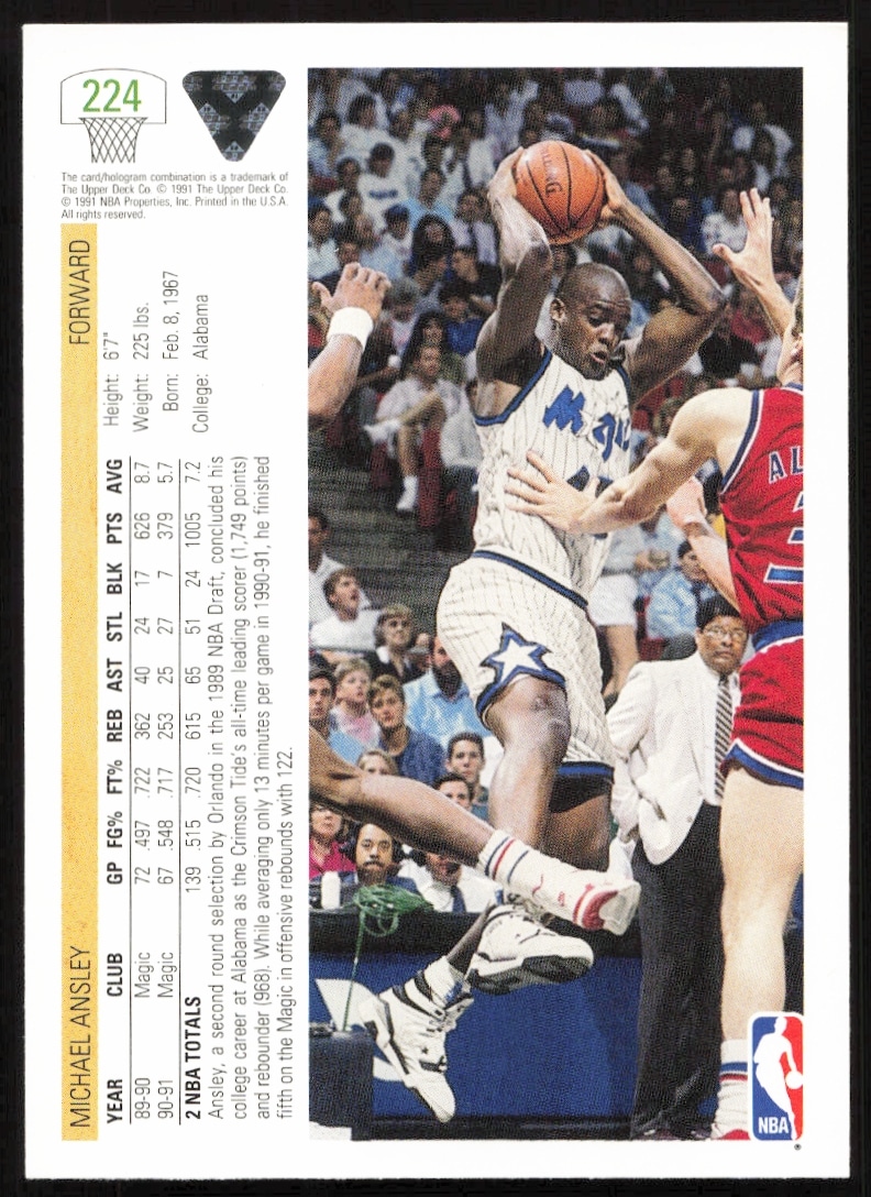 This Basketball card, from 1991-92 is part of the Upper Deck card set. Michael Ansley is featured and has a card number of 224.