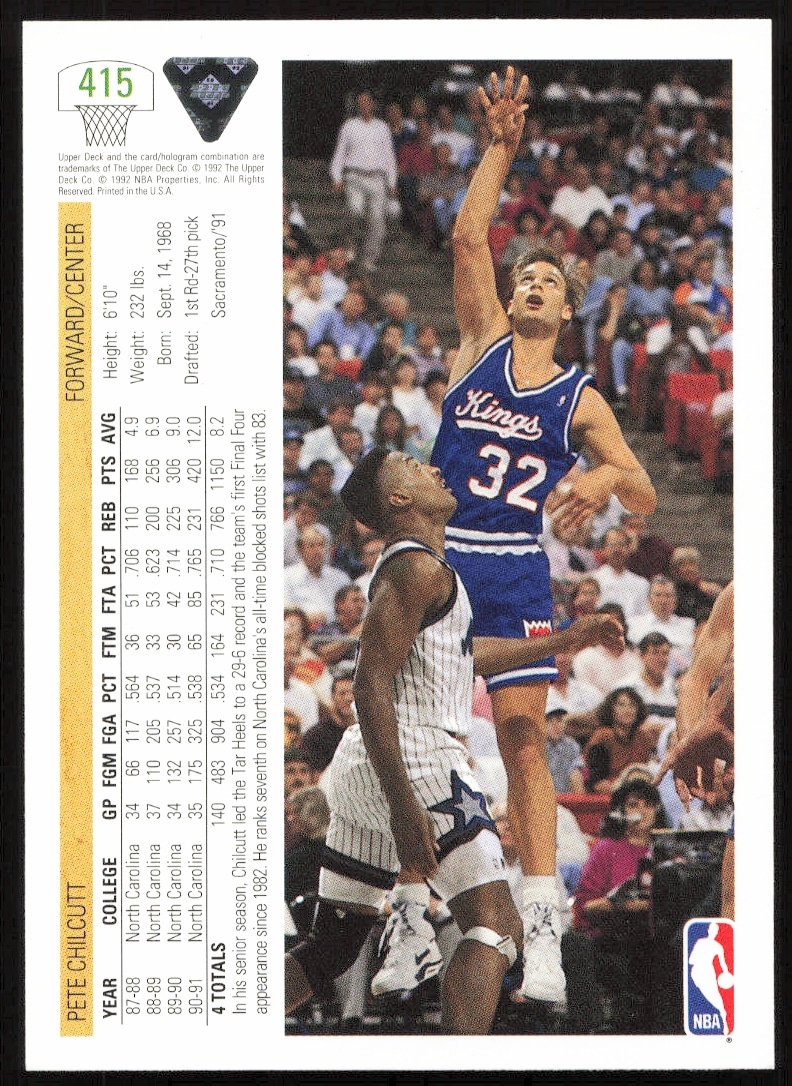 This Basketball card, from 1991-92 is part of the Upper Deck card set. Pete Chilcutt is featured and has a card number of 415.