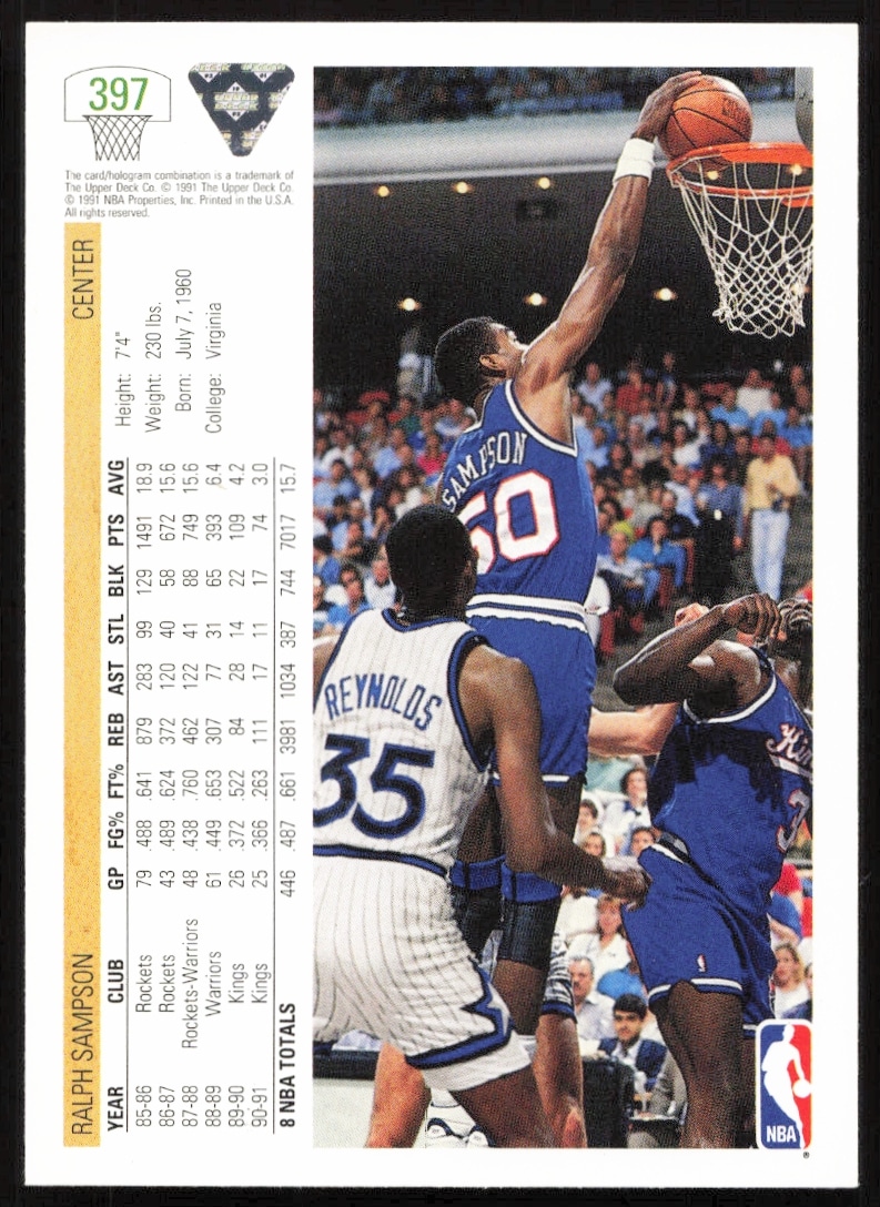 This Basketball card, from 1991-92 is part of the Upper Deck card set. Ralph Sampson is featured and has a card number of 397.