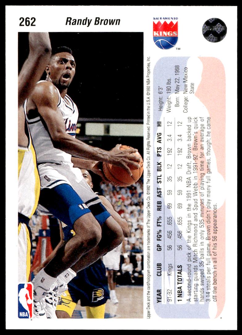 This BasketballΒ card, from 1991-92 is part of the Upper Deck Β card set. Randy Brown is featured and has a card number of 262.