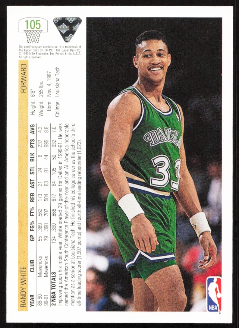 This Basketball card, from 1991-92 is part of the Upper Deck card set. Randy White is featured and has a card number of 105.