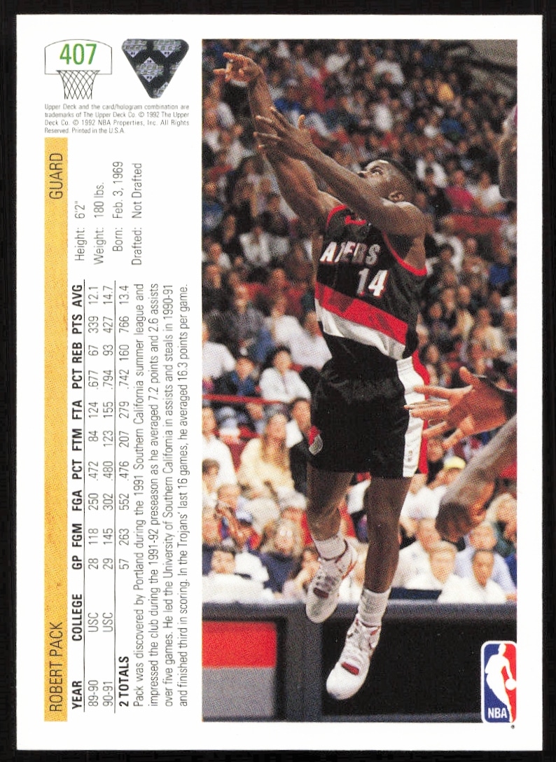 This Basketball card, from 1991-92 is part of the Upper Deck card set. Robert Pack is featured and has a card number of 407.