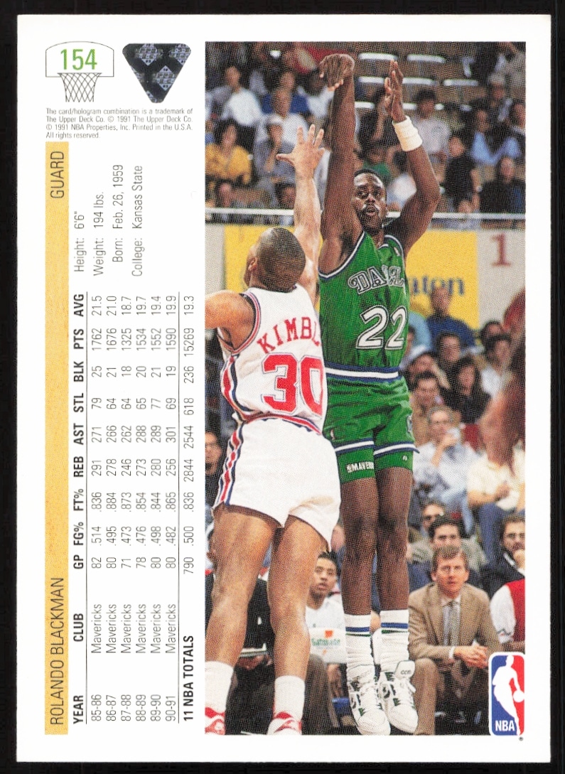 This Basketball card, from 1991-92 is part of the Upper Deck card set. Rolando Blackman is featured and has a card number of 154.