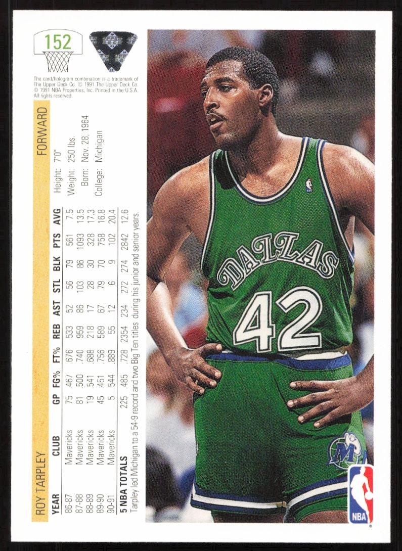 This Basketball card, from 1991-92 is part of the Upper Deck card set. Roy Tarpley is featured and has a card number of 152.