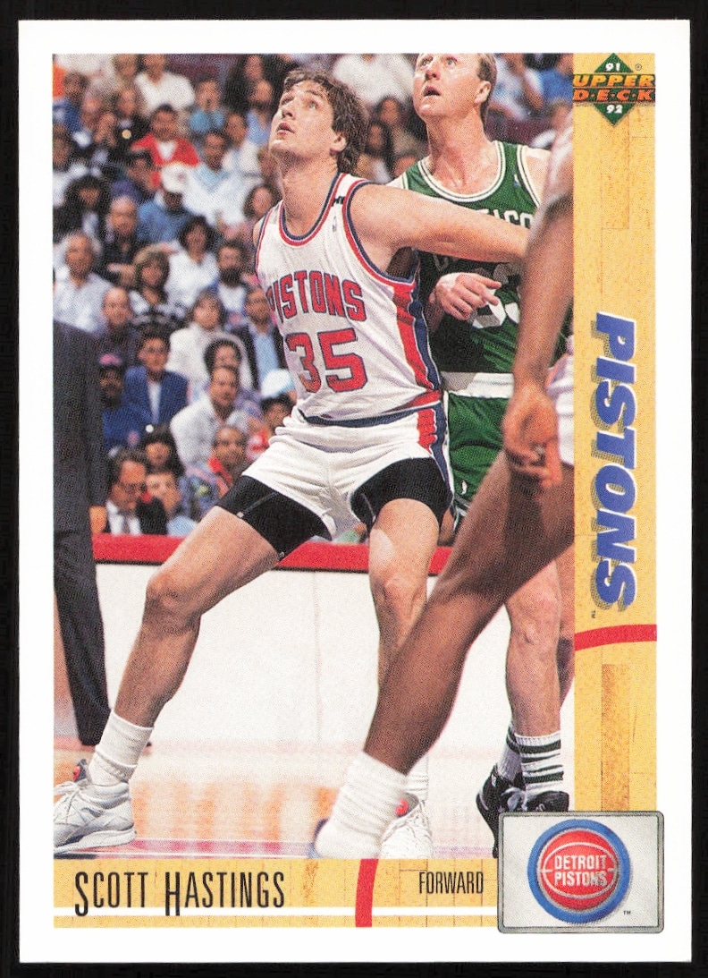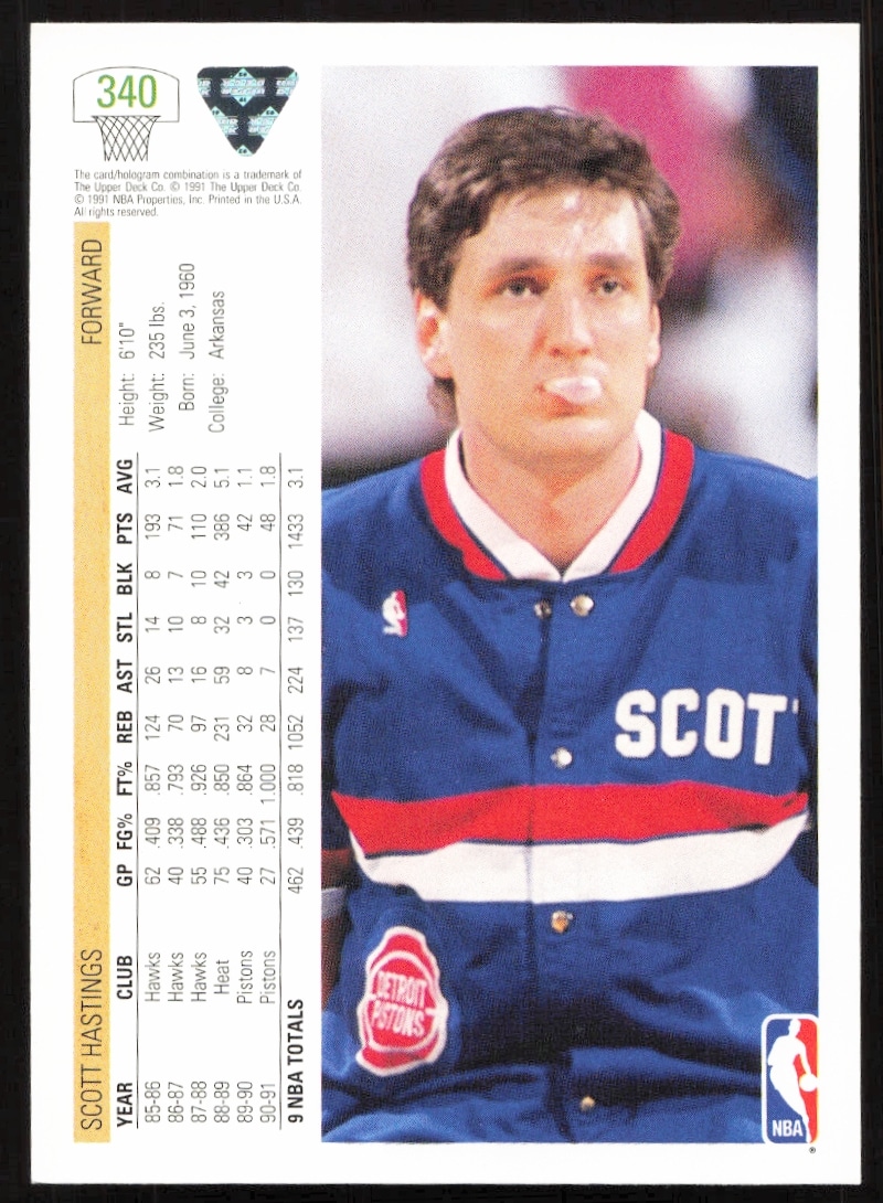 This Basketball card, from 1991-92 is part of the Upper Deck card set. Scott Hastings is featured and has a card number of 340.