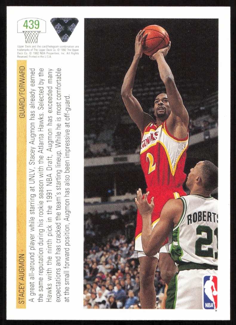 This Basketball card, from 1991-92 is part of the Upper Deck card set. Stacey Augmon is featured and has a card number of 439.