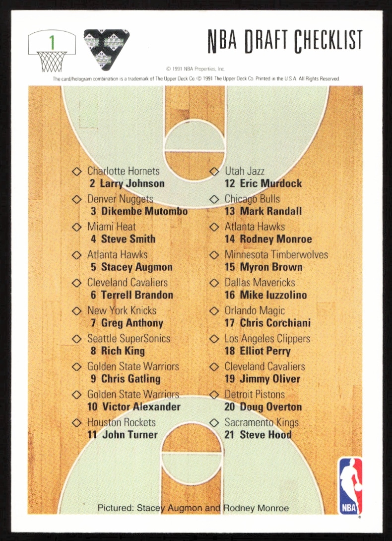 This Basketball card, from 1991-92 is part of the Upper Deck card set. Stacey Augmon / Rodney Monroe is featured and has a card number of 1.