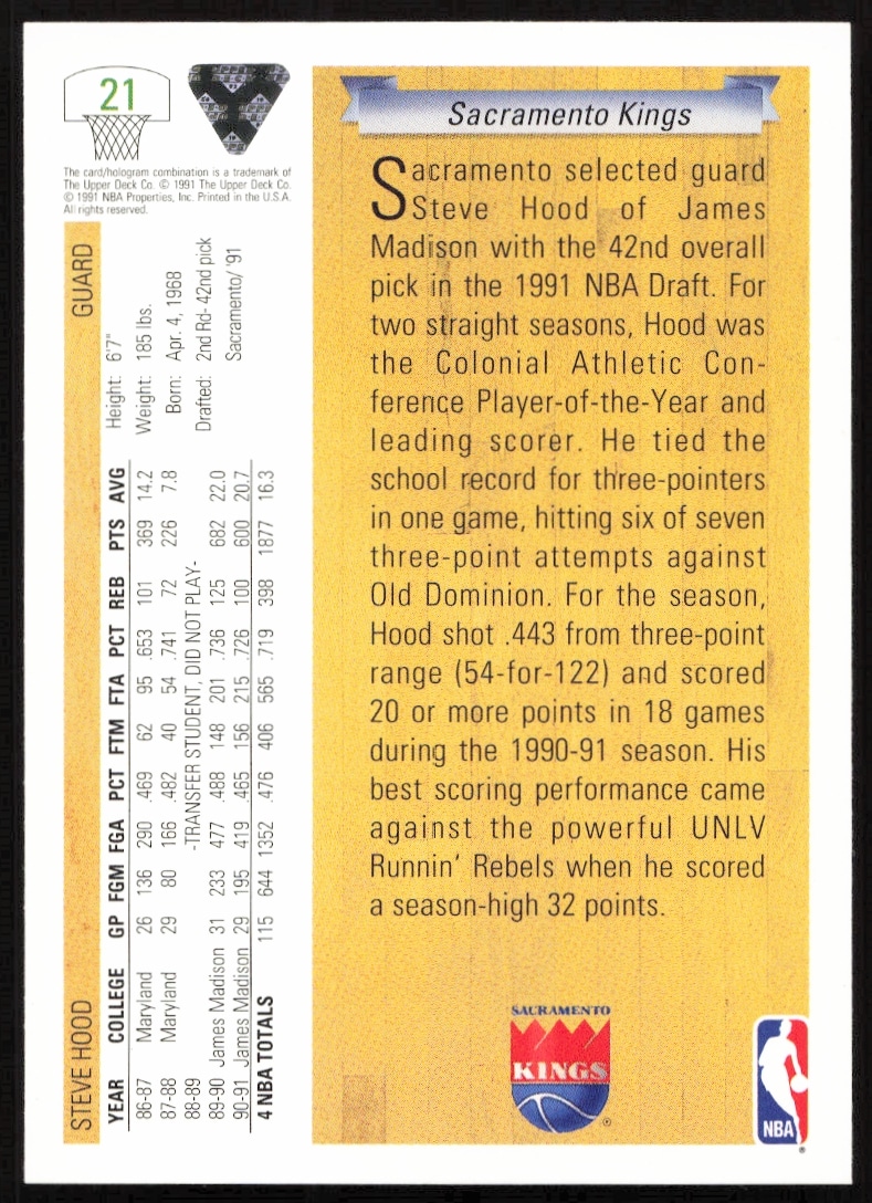 This Basketball card, from 1991-92 is part of the Upper Deck card set. Steve Hood is featured and has a card number of 21.
