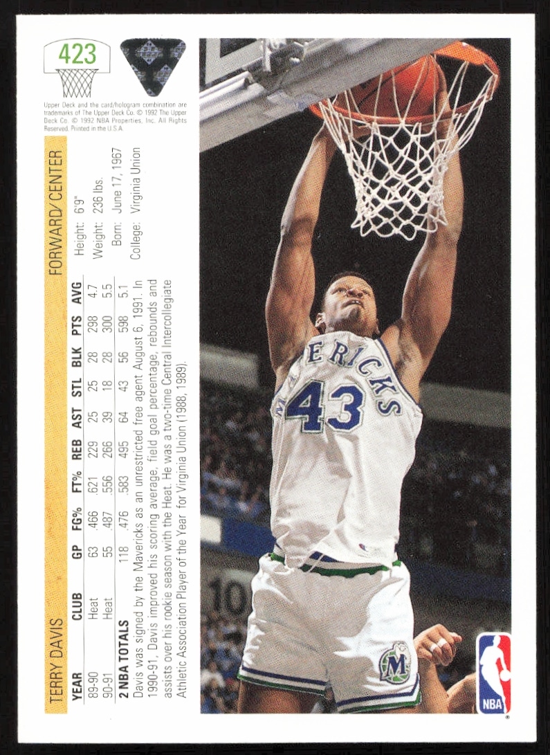 This Basketball card, from 1991-92 is part of the Upper Deck card set. Terry Davis is featured and has a card number of 423.
