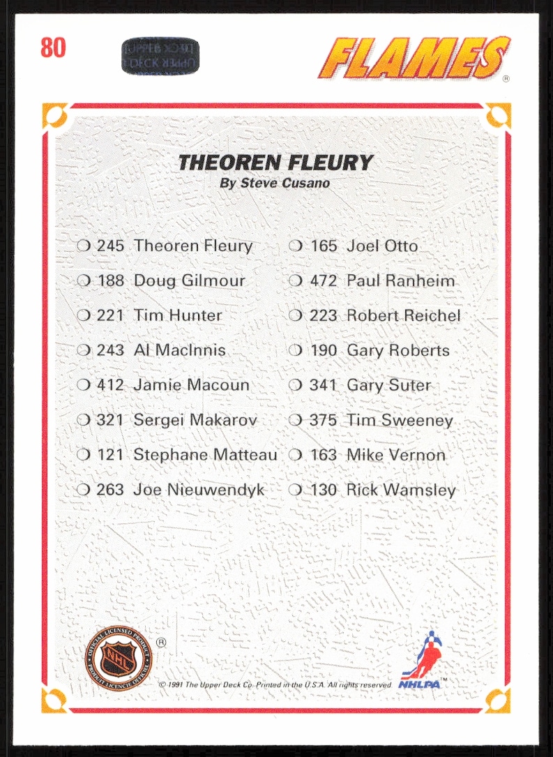 This Hockey card, from 1991-92 is part of the Upper Deck card set. Theoren Fleury is featured and has a card number of 80.