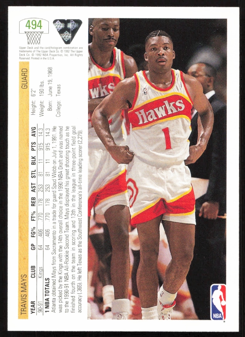 This Basketball card, from 1991-92 is part of the Upper Deck card set. Travis Mays is featured and has a card number of 494.