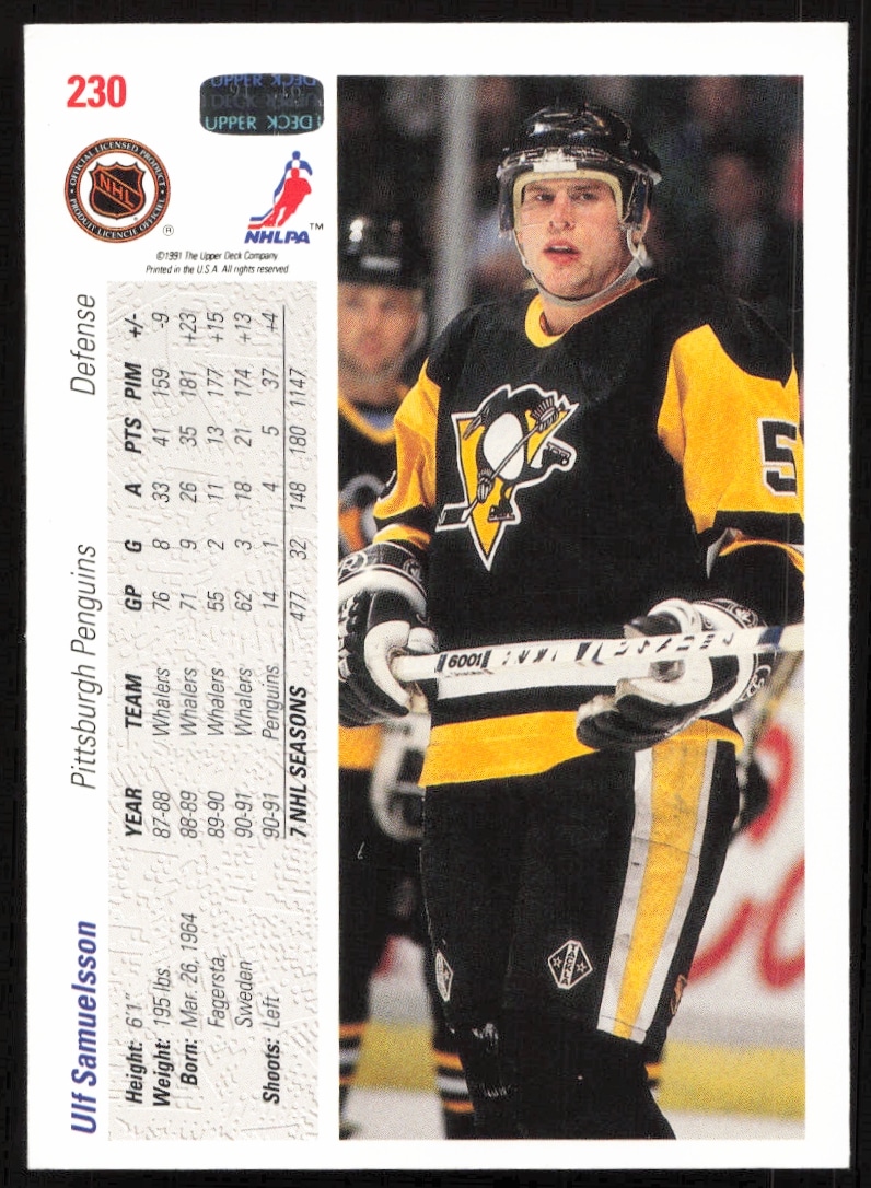 This Hockey card, from 1991-92 is part of the Upper Deck card set. Ulf Samuelsson is featured and has a card number of 230.