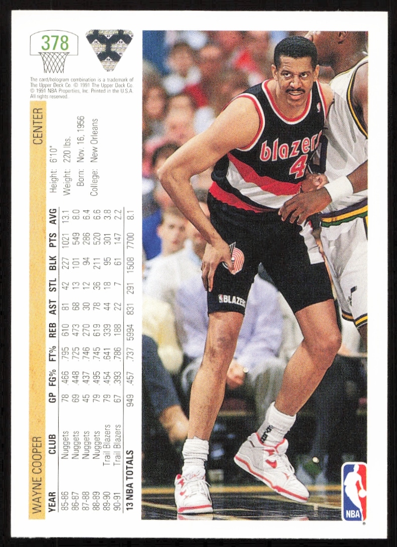 This Basketball card, from 1991-92 is part of the Upper Deck card set. Wayne Cooper is featured and has a card number of 378.