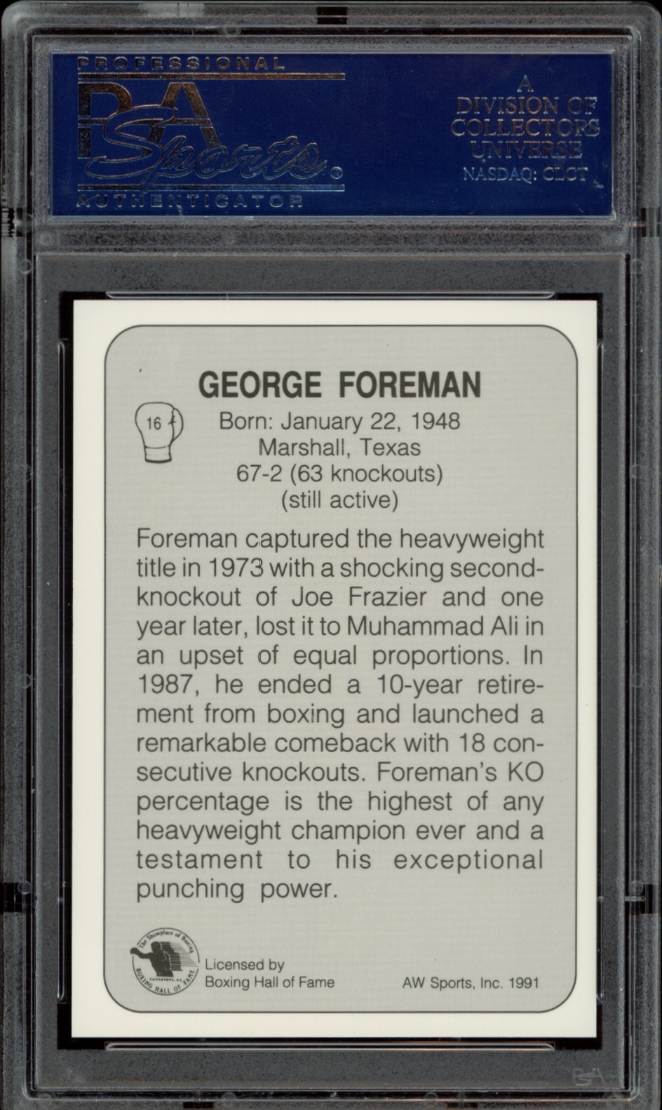 This Boxing card, from 1991 is part of the AW Sports Boxing card set. George Foreman is featured and has a card number of 16. It is graded by PSA and has a numeric grade of 7.