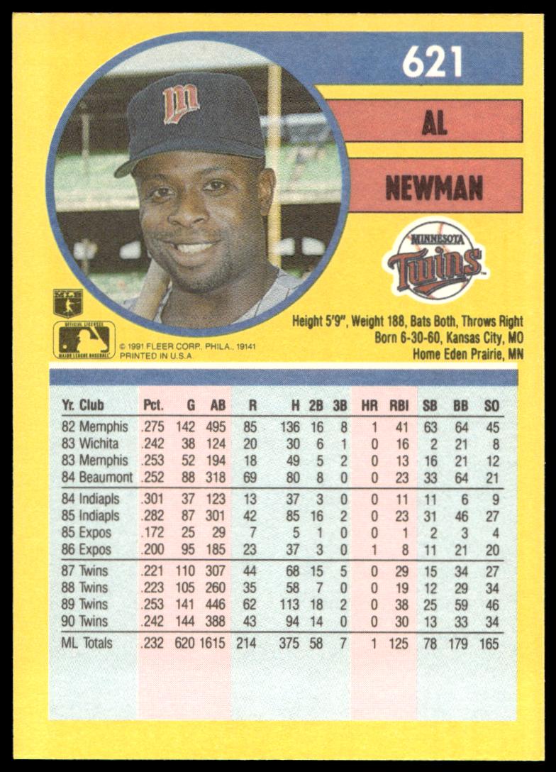 This Baseball card, from 1991 is part of the Fleer  card set. Al Newman is featured and has a card number of 621.